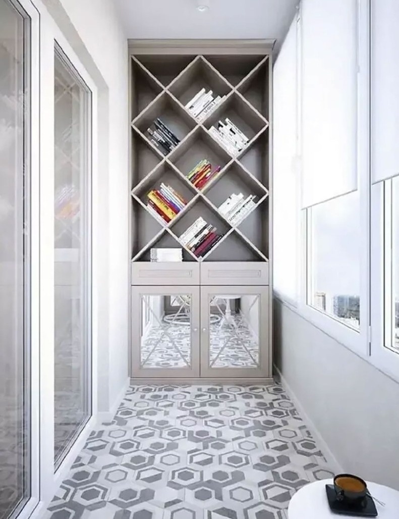 Шкаф с диагональными полками и зеркалом на балкон «Модель 948»