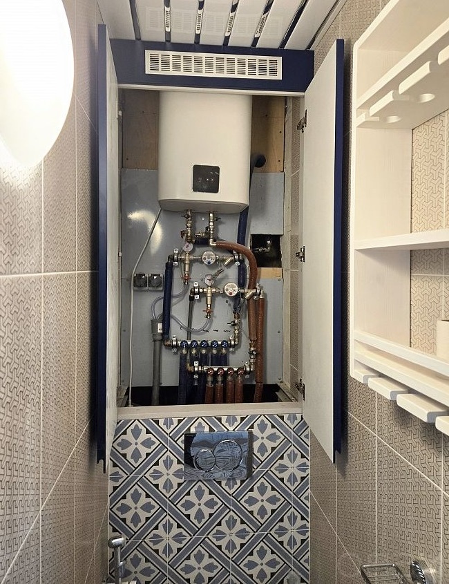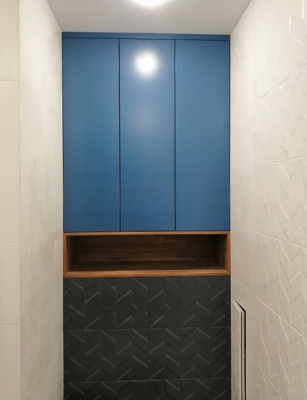 Маленький синий шкафчик над инсталляцией в санузел «Модель 1355»