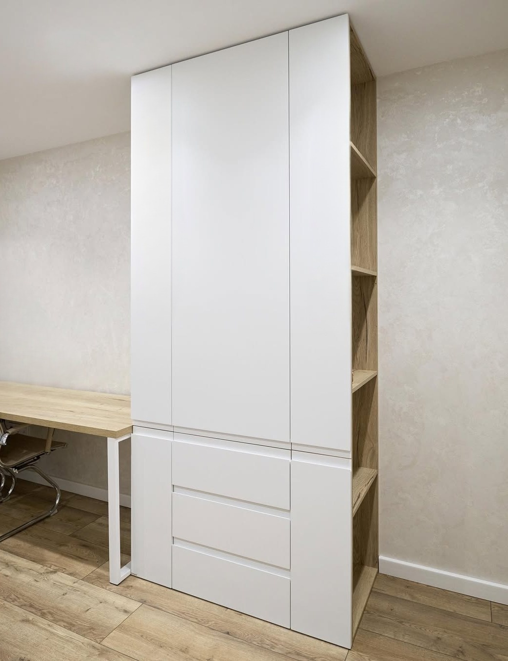 Узкий белый шкаф с рабочей зоной в стиле сканди «Модель 887»