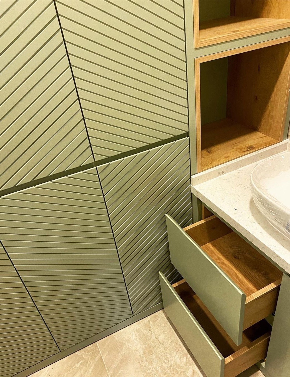 Встроенный угловой шкаф с тумбой в ванную «Модель 1218»