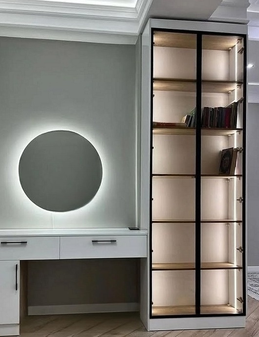 Узкий шкаф с рабочей зоной и зеркалом «Модель 230»