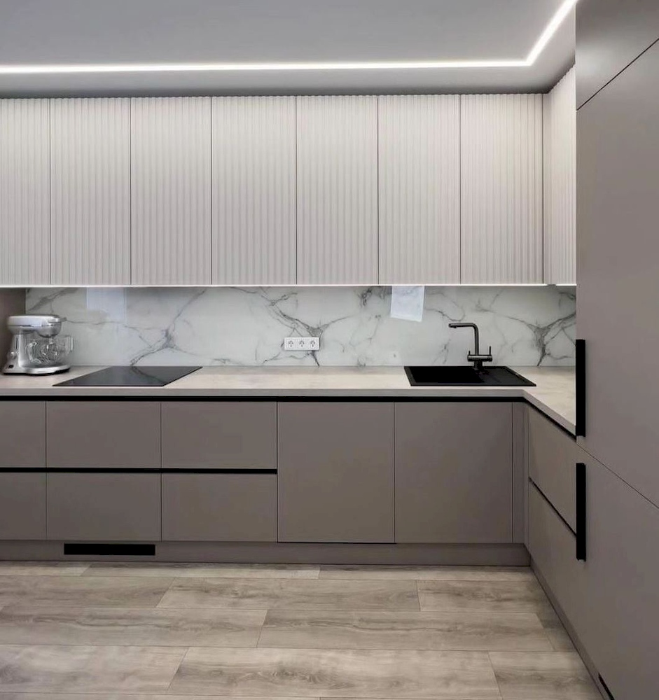 Кухню доставим на объект в собранных коробах, а не в виде отдельных деталей. Такой подход позволяет избежать повреждений гарнитура и произвести монтаж в течение одного дня.