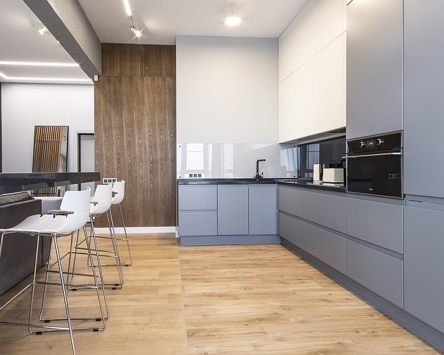 Бело-серая кухня с высокой антресолью «Модель 967»