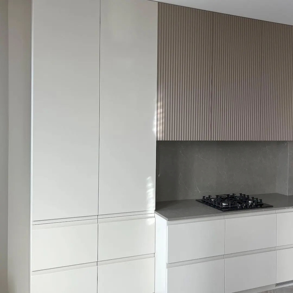 Большая белая кухня с рифлеными фасадами «Модель 633»