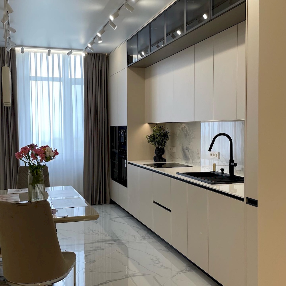 Большая прямая кухня с антресолью витриной «Модель 855»