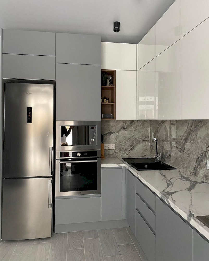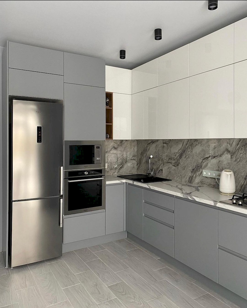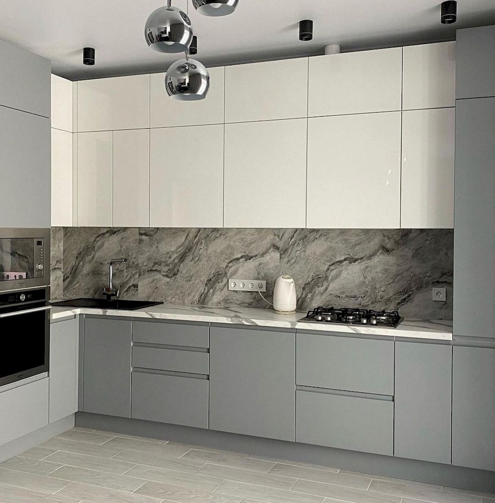 Бело-серая кухня с высокой антресолью «Модель 967»