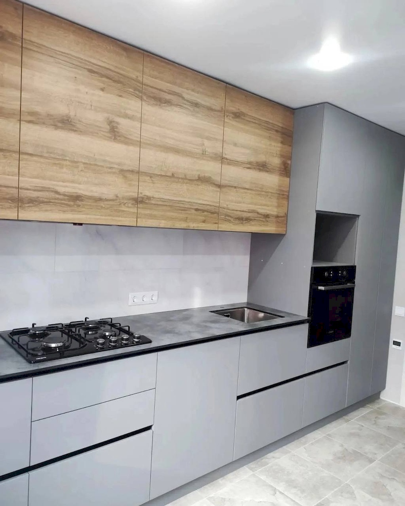 Большая прямая кухня с антресолью витриной «Модель 855»