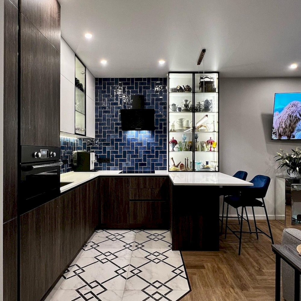 • ФормаП-образная, Кухня-гостиная, С барной стойкой, Большая, С пеналом