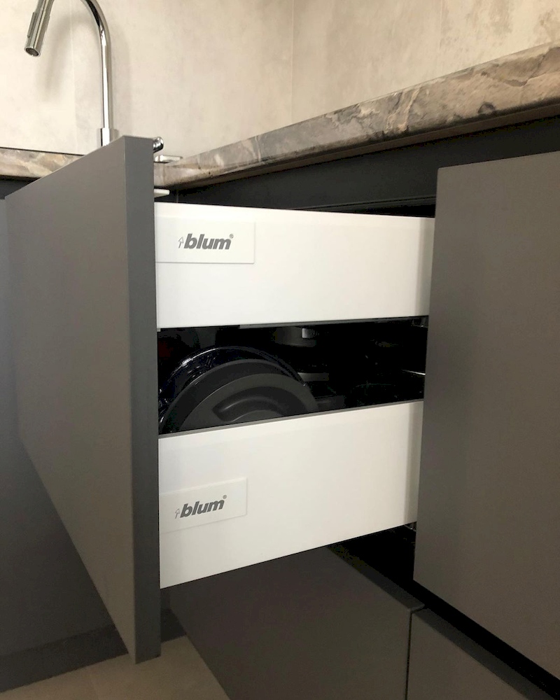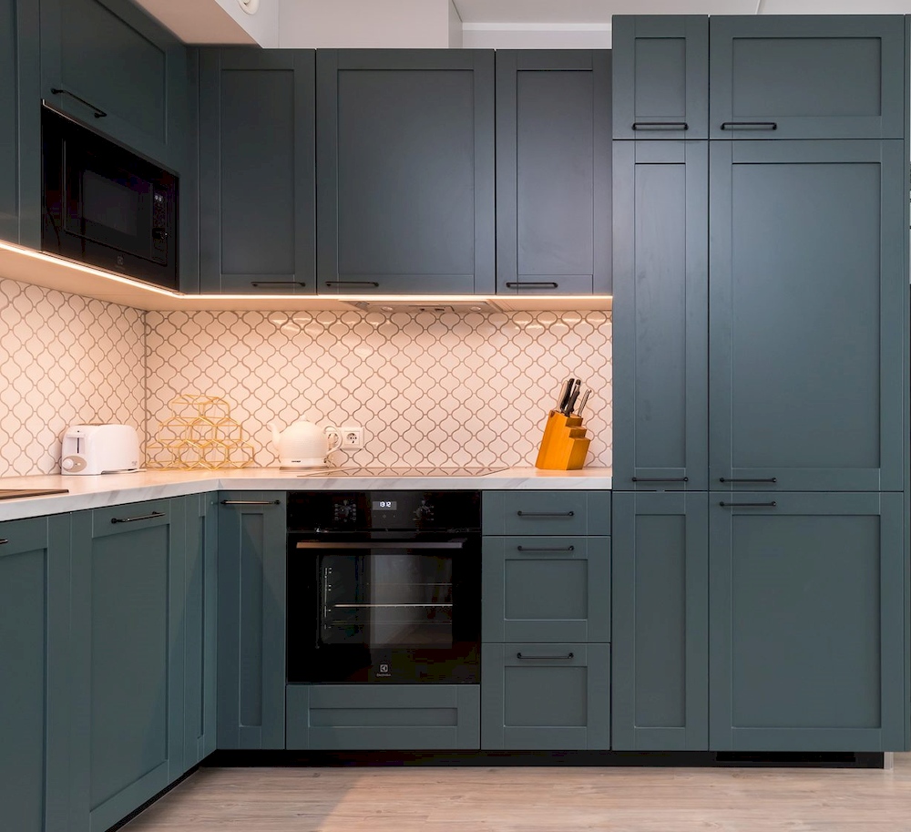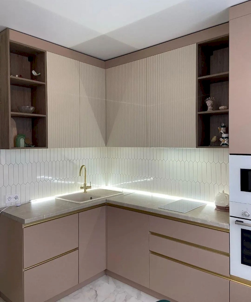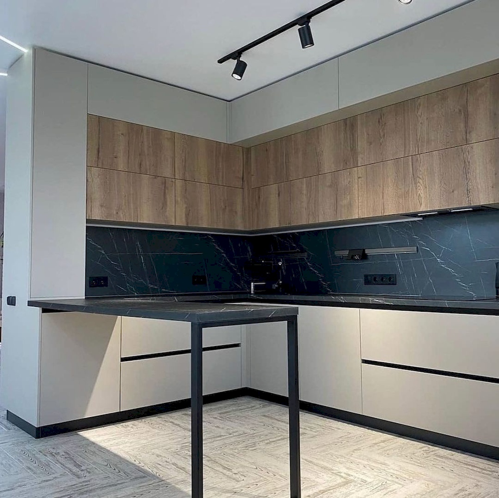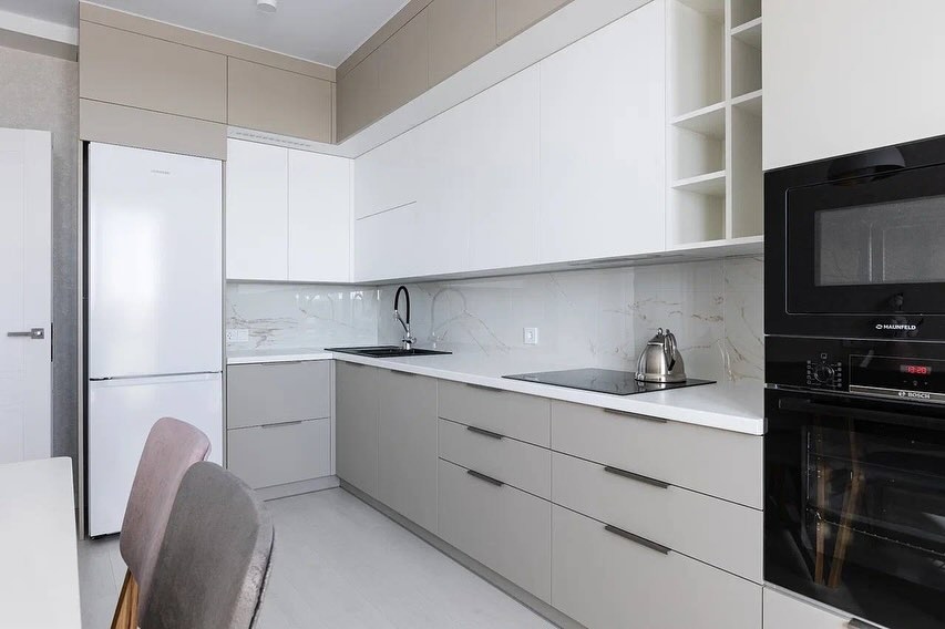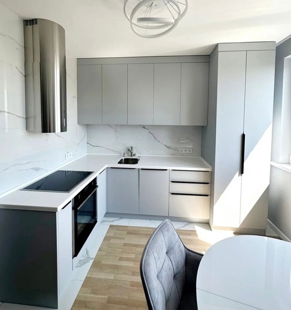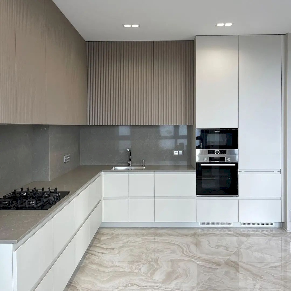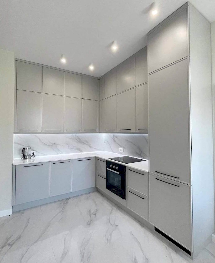 Серая угловая кухня с высокими шкафами «Модель 851»