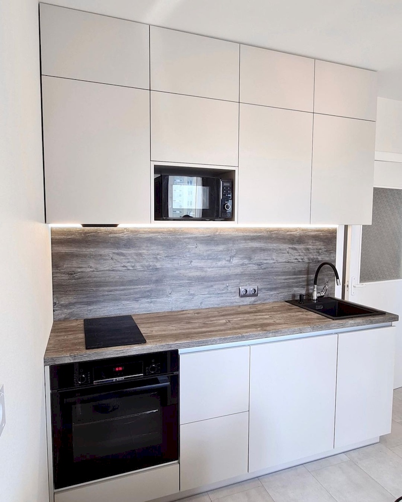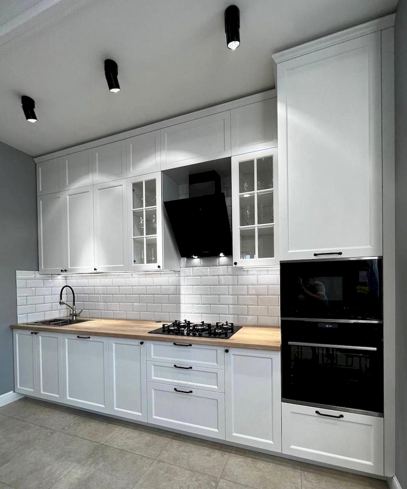 Кухню доставим на объект в собранных коробах, а не в виде отдельных деталей. Такой подход позволяет избежать повреждений гарнитура и произвести монтаж в течение одного дня.