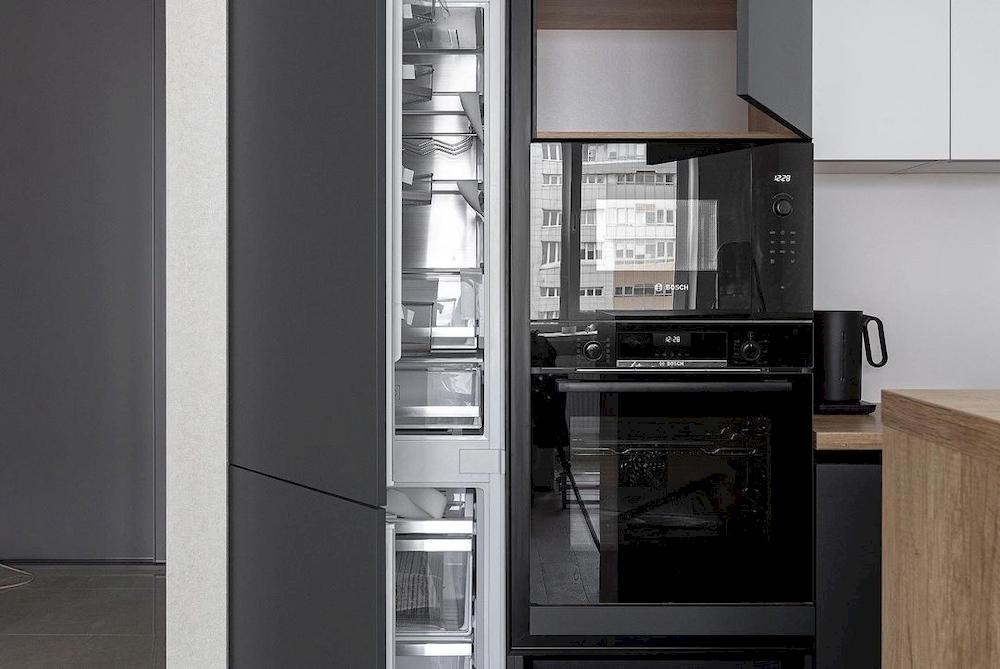 Один из главных наших принципов – спроектировать кухню согласно логике перемещений в процессе приготовления еды. Достаёте продукты из холодильника, моете, обрабатываете, готовите. Правильно, когда вы при этом делаете, как можно меньше лишних движений, колдуя над блюдом.