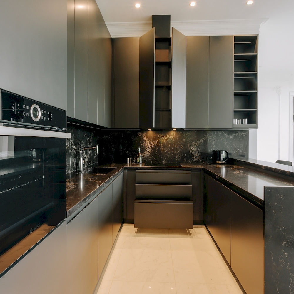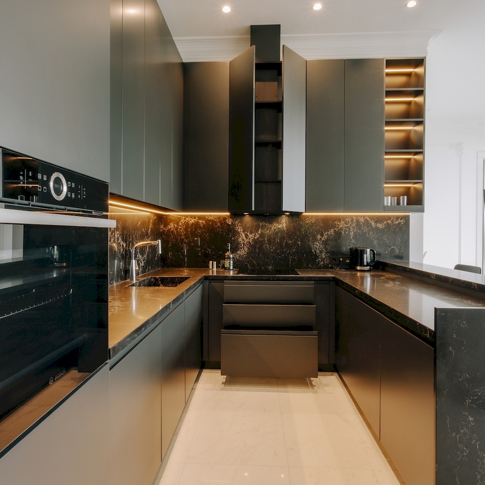 Кухню доставим на объект в собранных коробах, а не в виде отдельных деталей. Такой подход позволяет избежать повреждений гарнитура и произвести монтаж в течение одного дня.