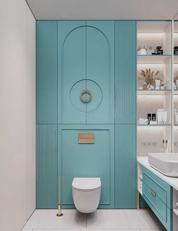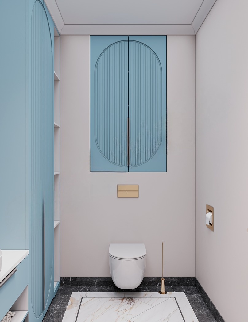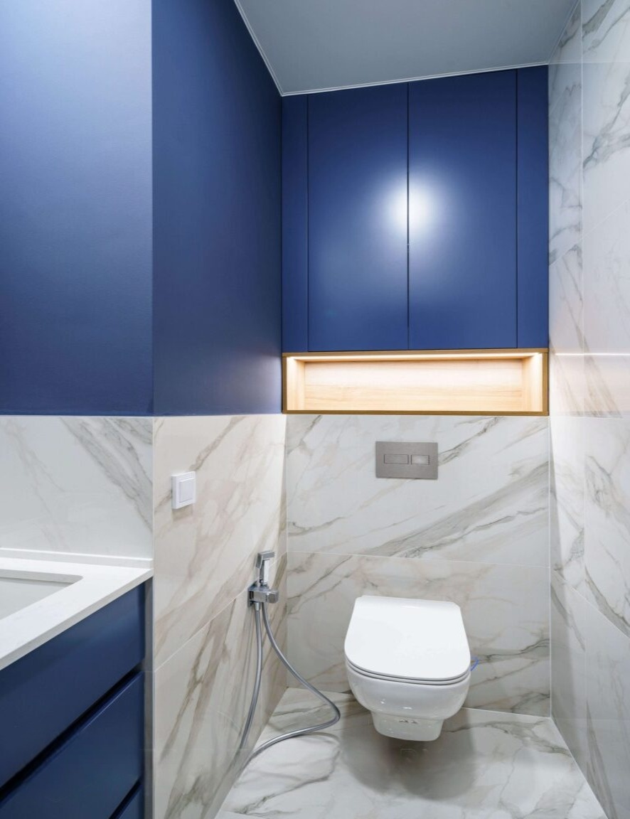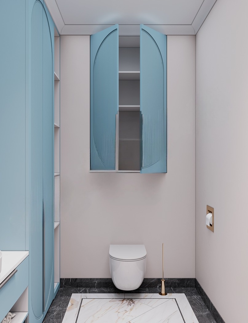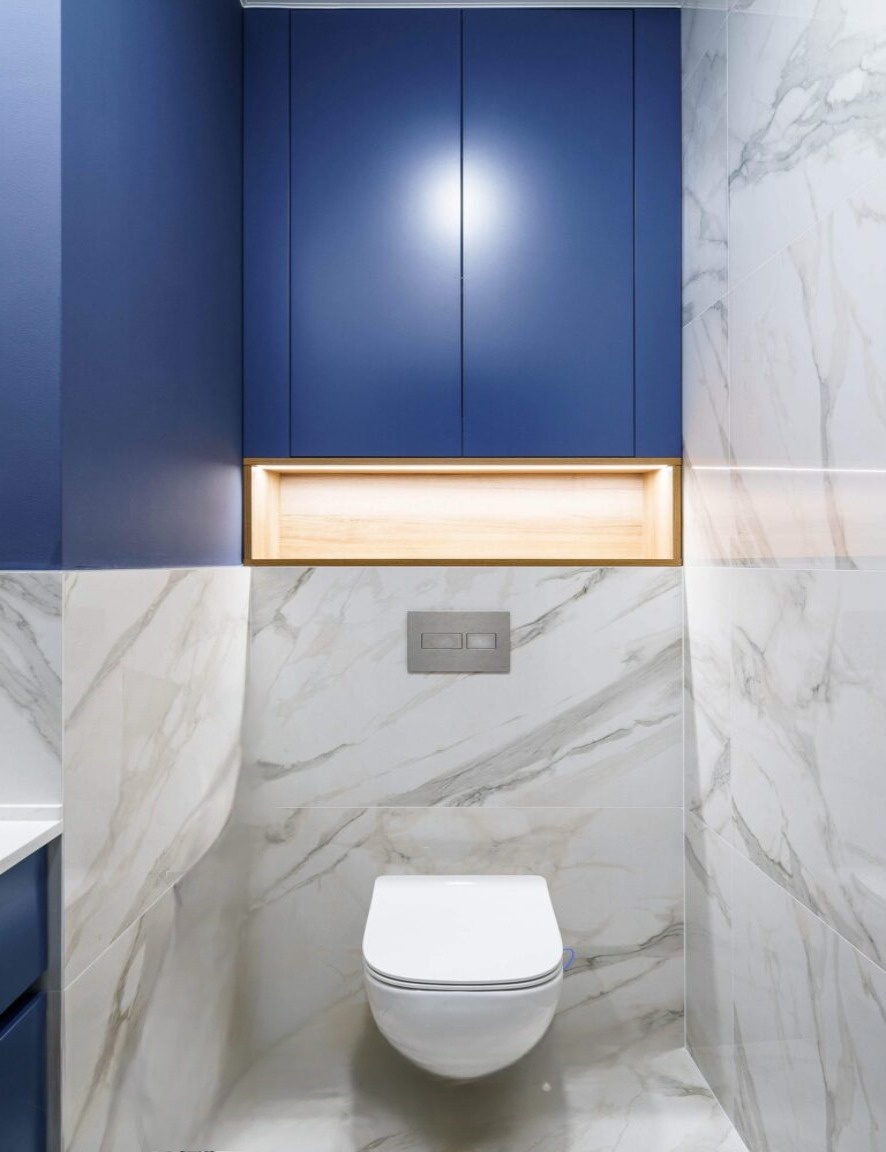 Маленький синий шкафчик над инсталляцией в санузел «Модель 1355»