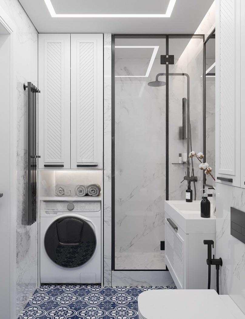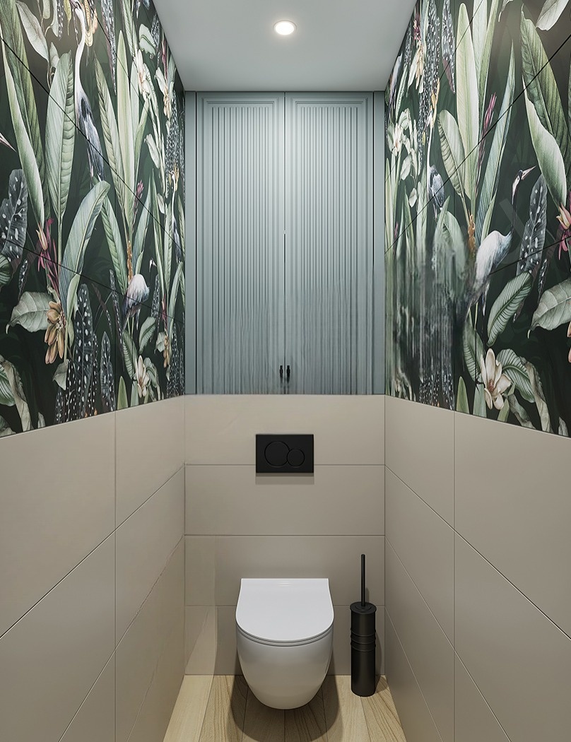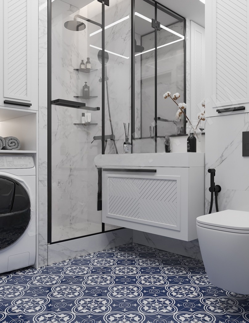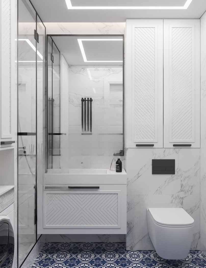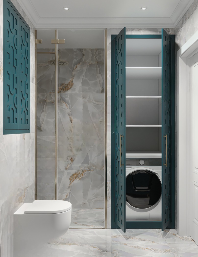 Маленький синий шкафчик над инсталляцией в санузел «Модель 1355»