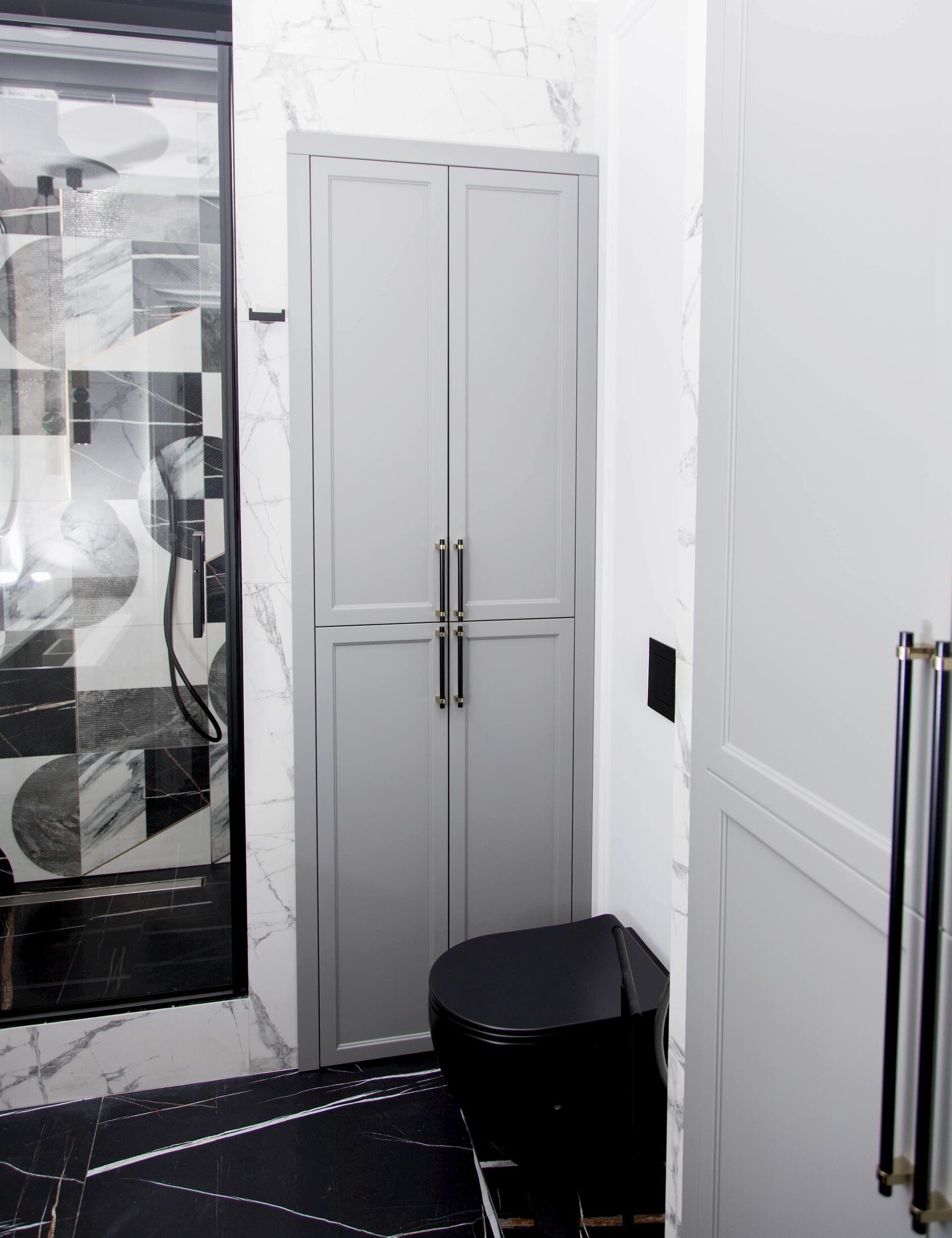 Высокий шкаф серого цвета с фрезерованными дверями в санузел «Модель 1033»