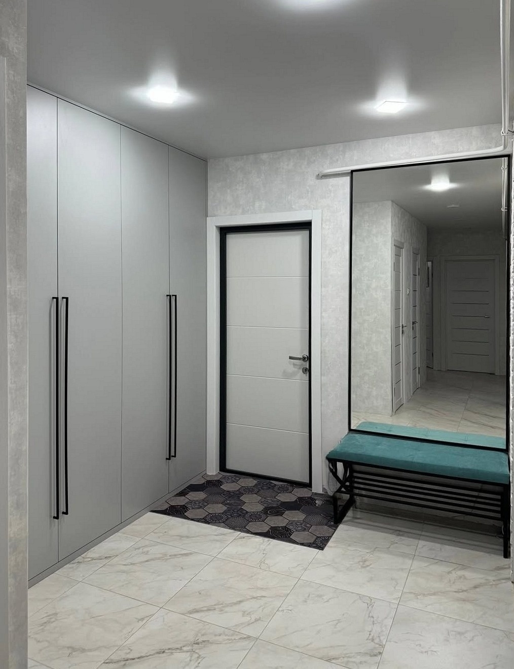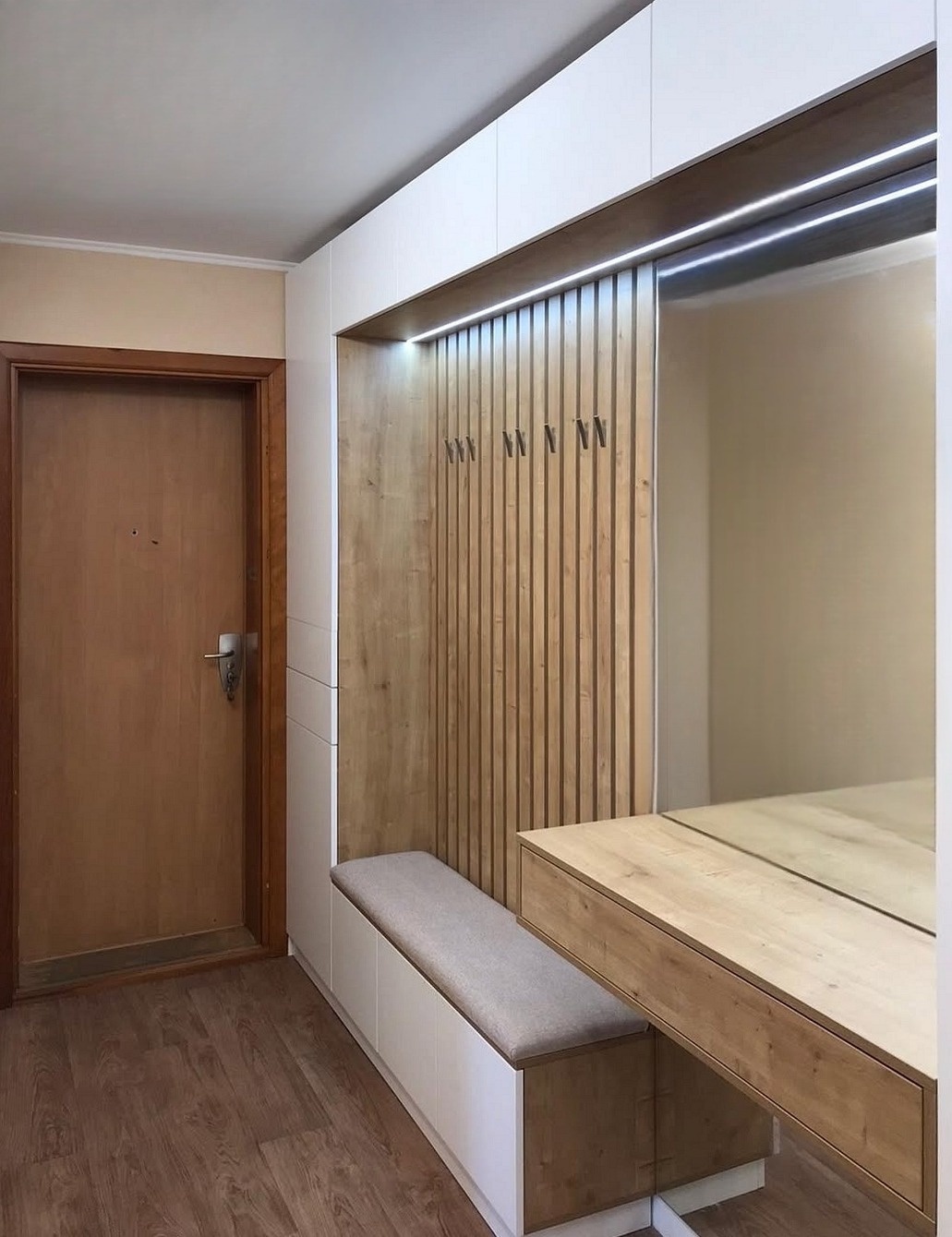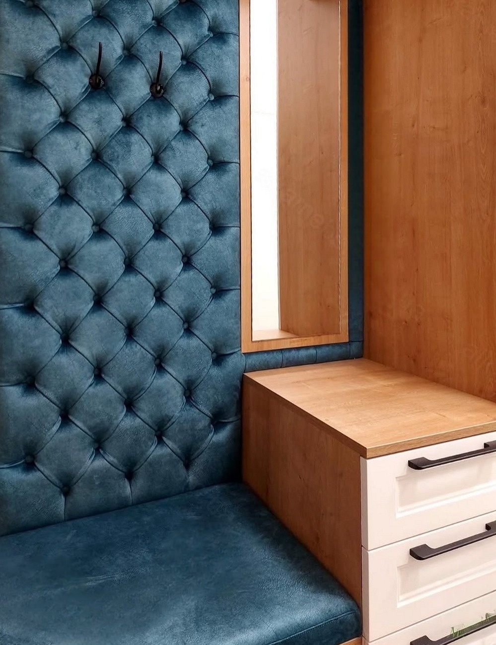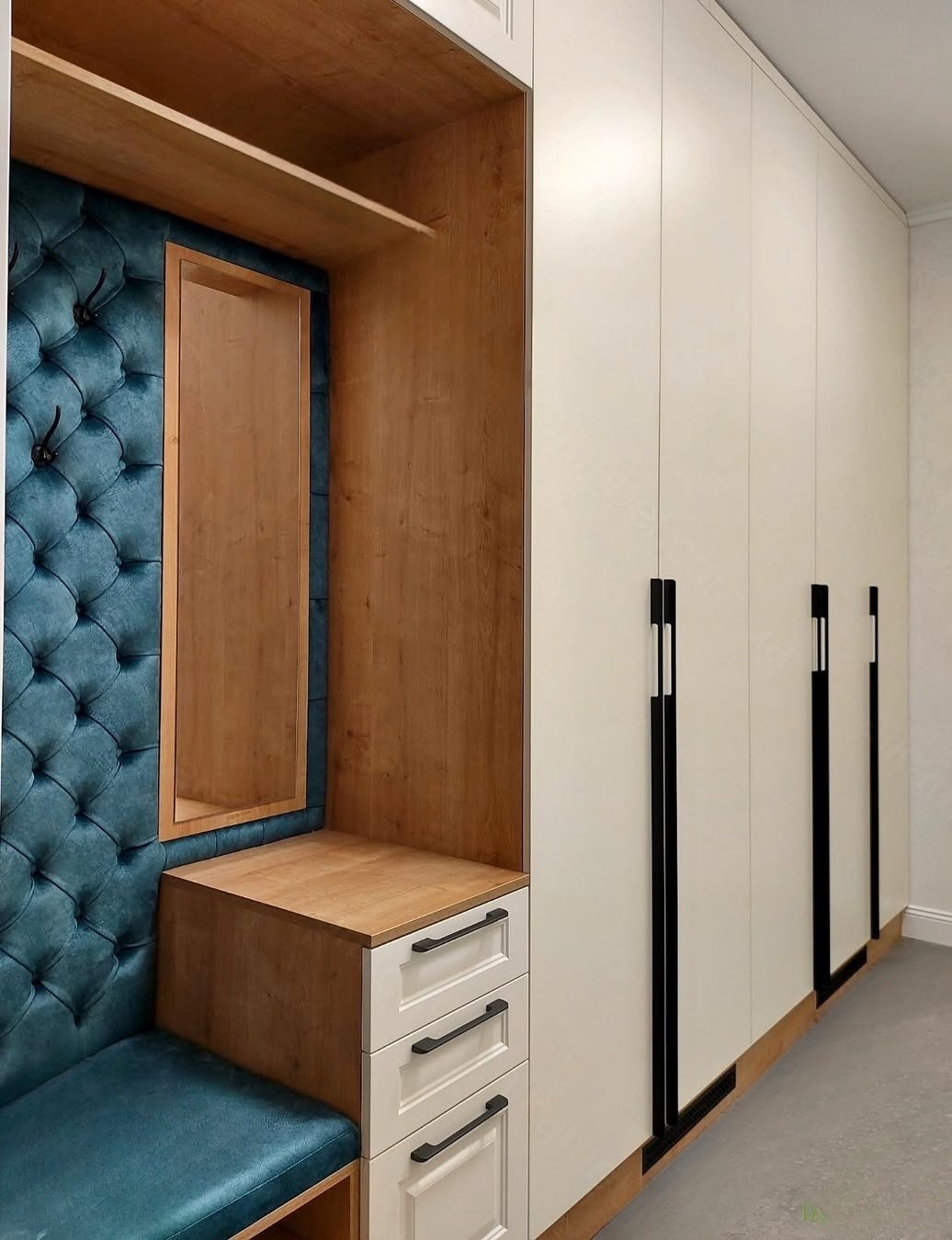 Большая встроенная прихожая с мягкой вешалкой и зеркалом «Модель 604»