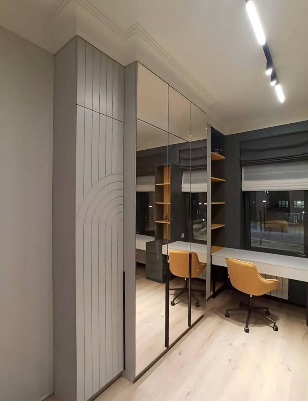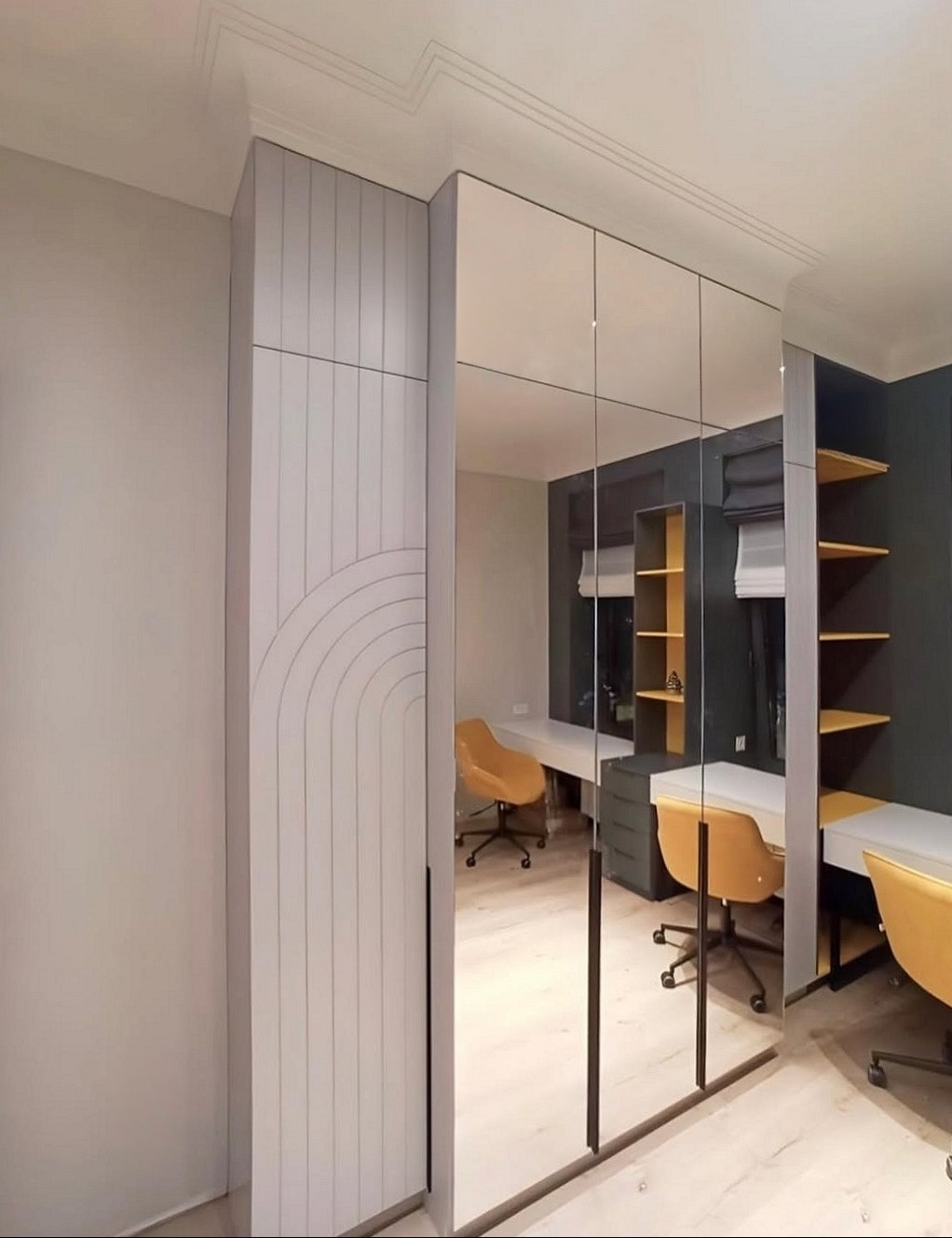 Встроенный зеркальный шкаф с двумя столами в детскую «Модель 1003»