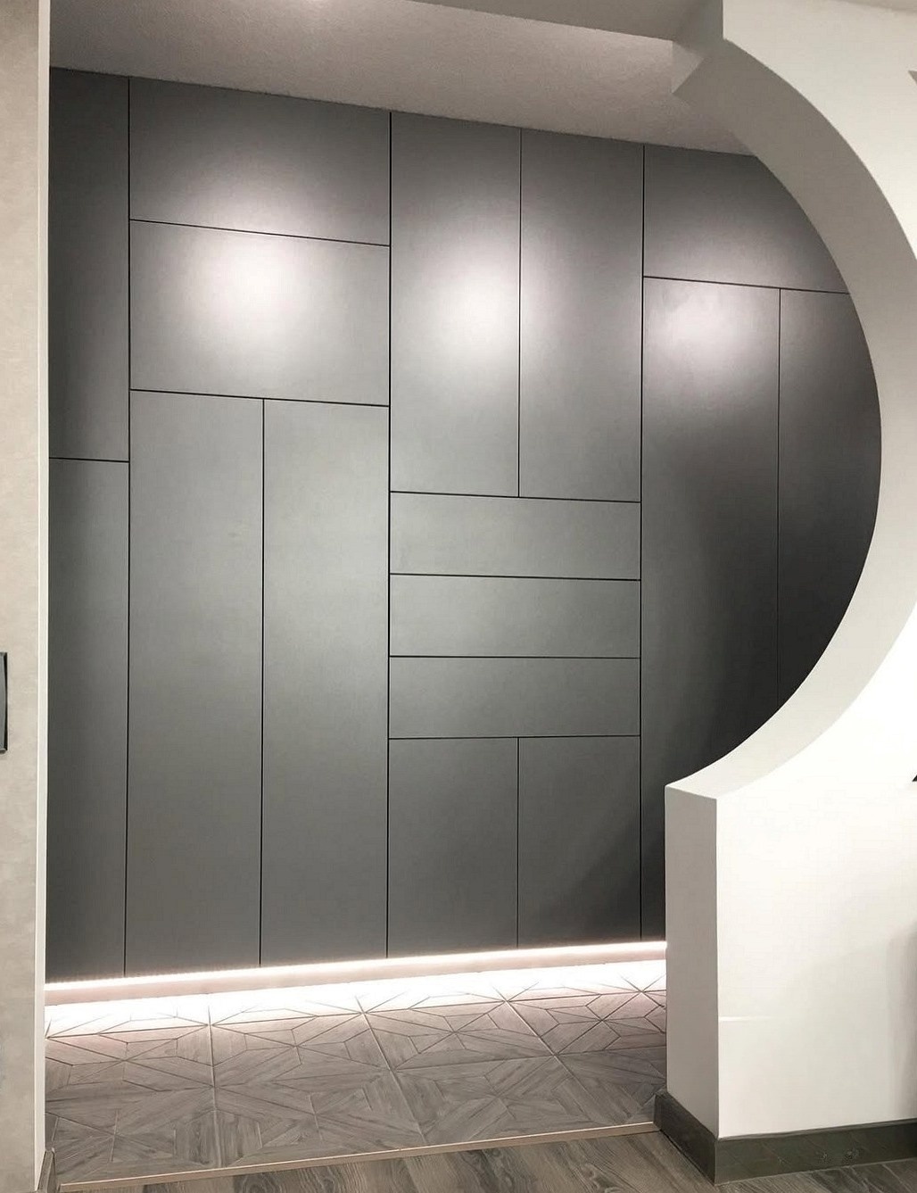 Серый шкаф во всю стену с нишей под тв «Модель 155»
