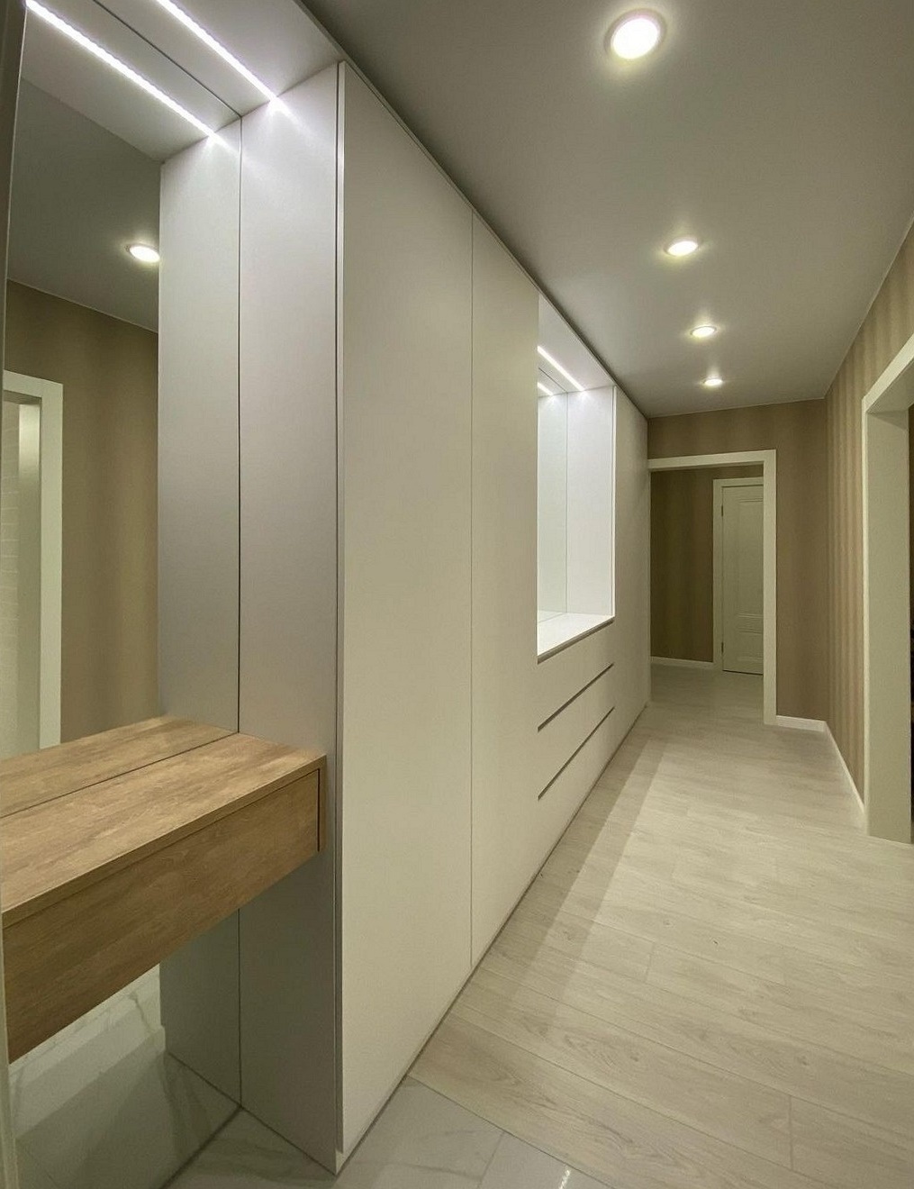 Большая встроенная прихожая с мягкой вешалкой и зеркалом «Модель 604»