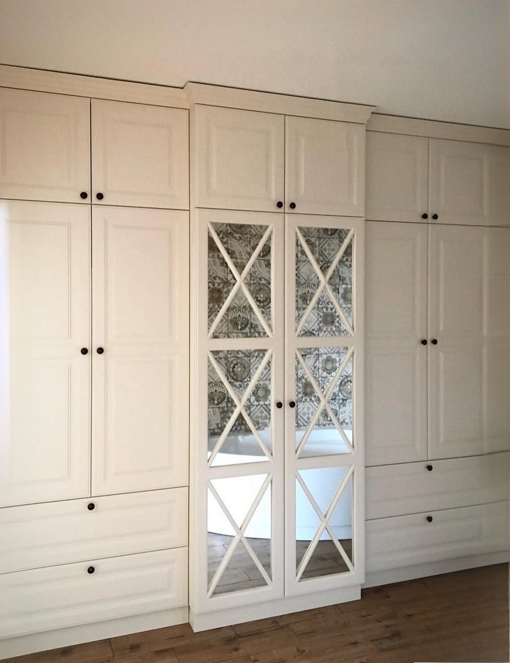 Белый шкаф в классическом стиле с фрезерованными дверями и зеркалом «Модель 344»