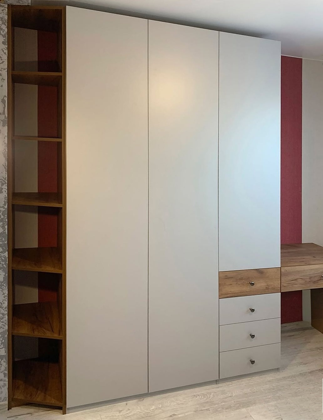 Встроенный шкаф цвета бетон с открытыми полками «Модель 422»