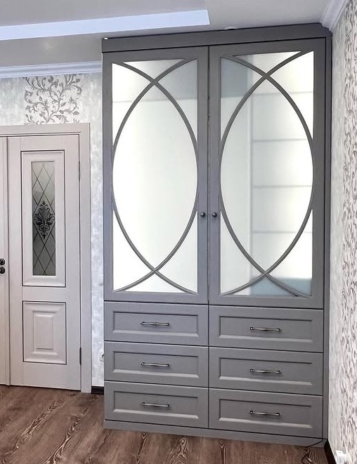 Серый распашной шкаф-гардероб с выдвижными ящиками «Модель 317»