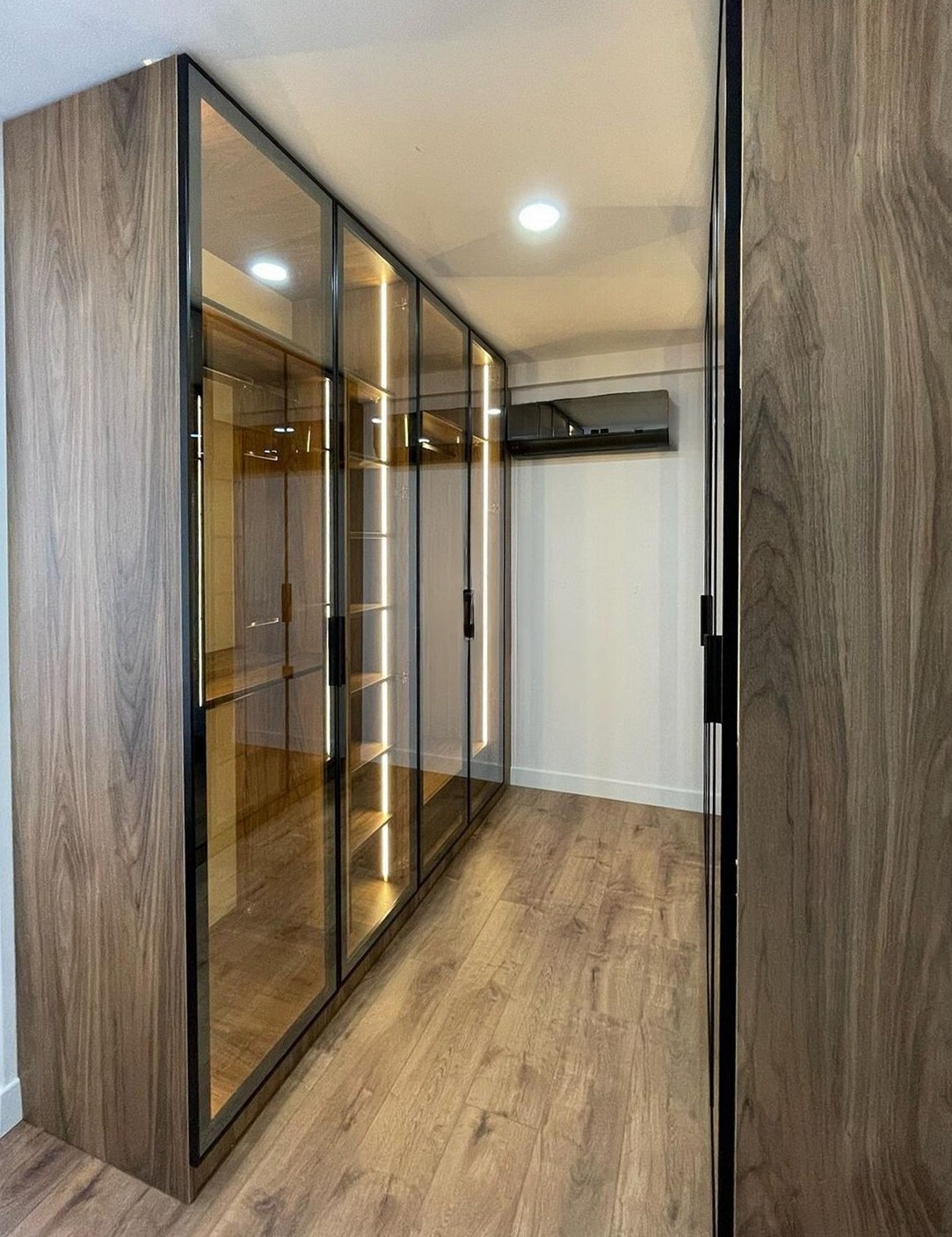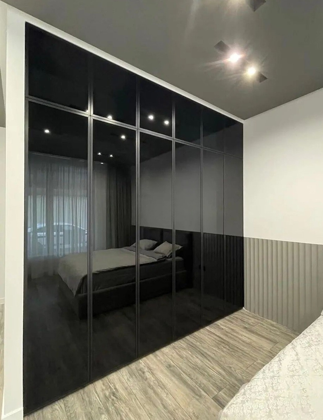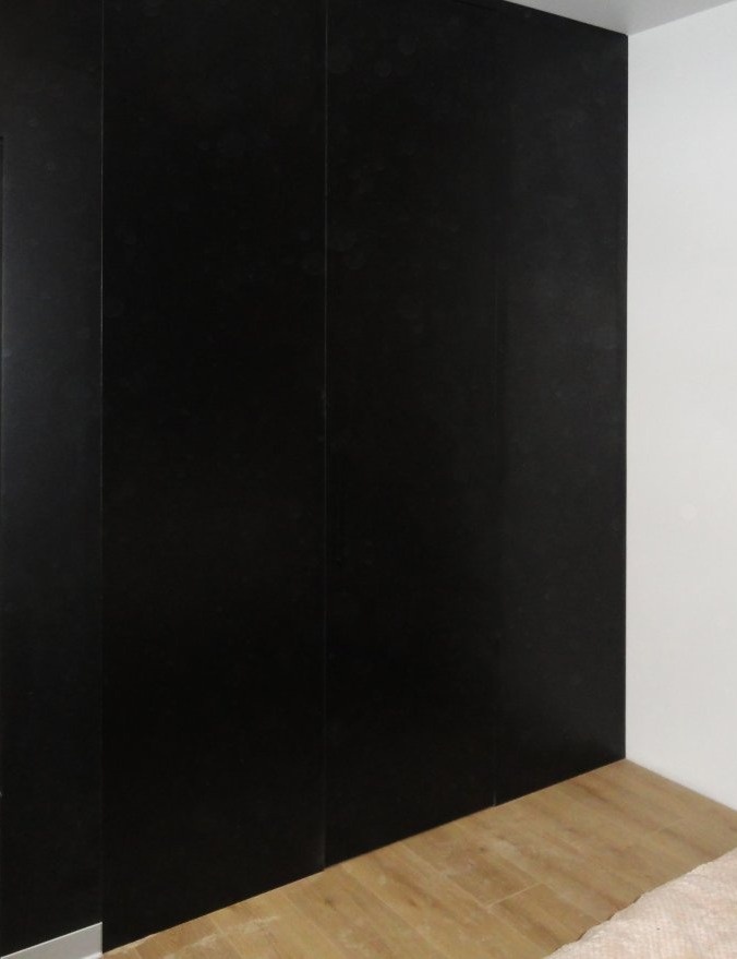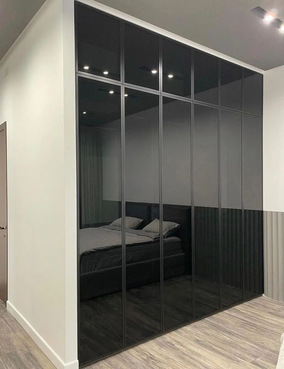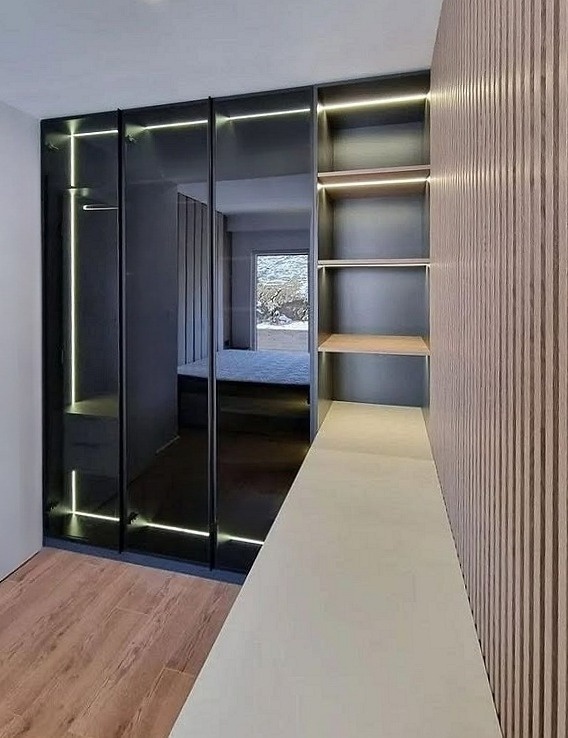 Гардеробная со встроенными дверями-купе из черного стекла «Модель 605»