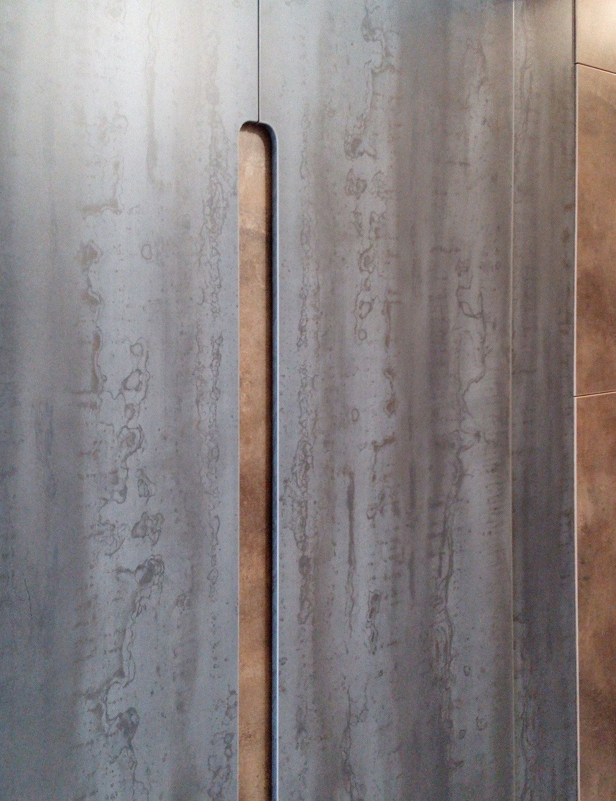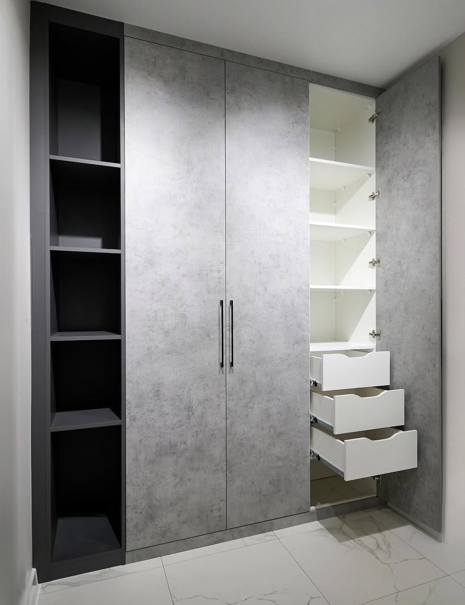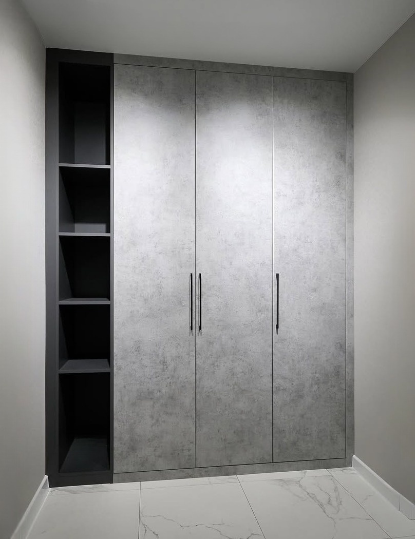 Встроенный шкаф цвета бетон с открытыми полками «Модель 421»
