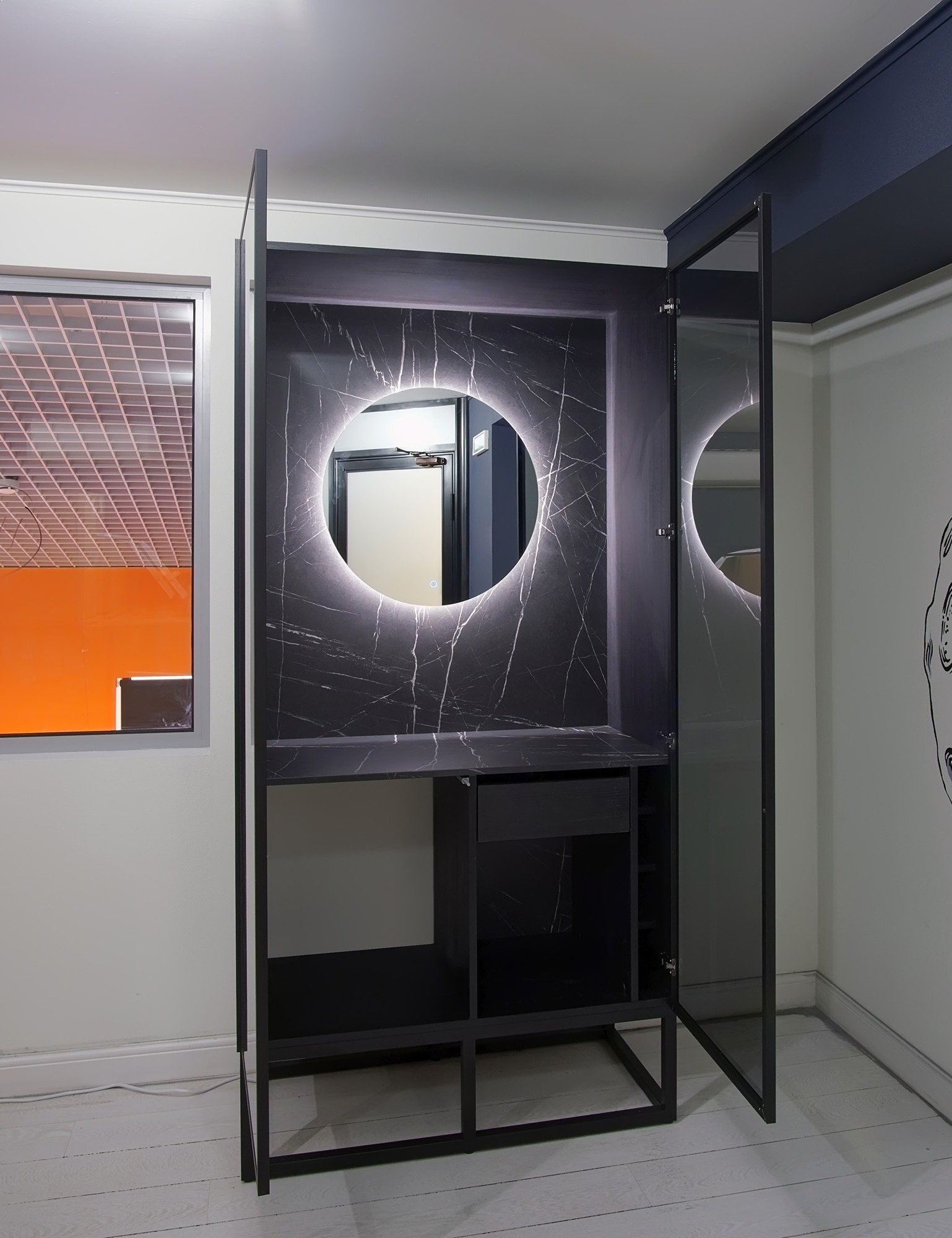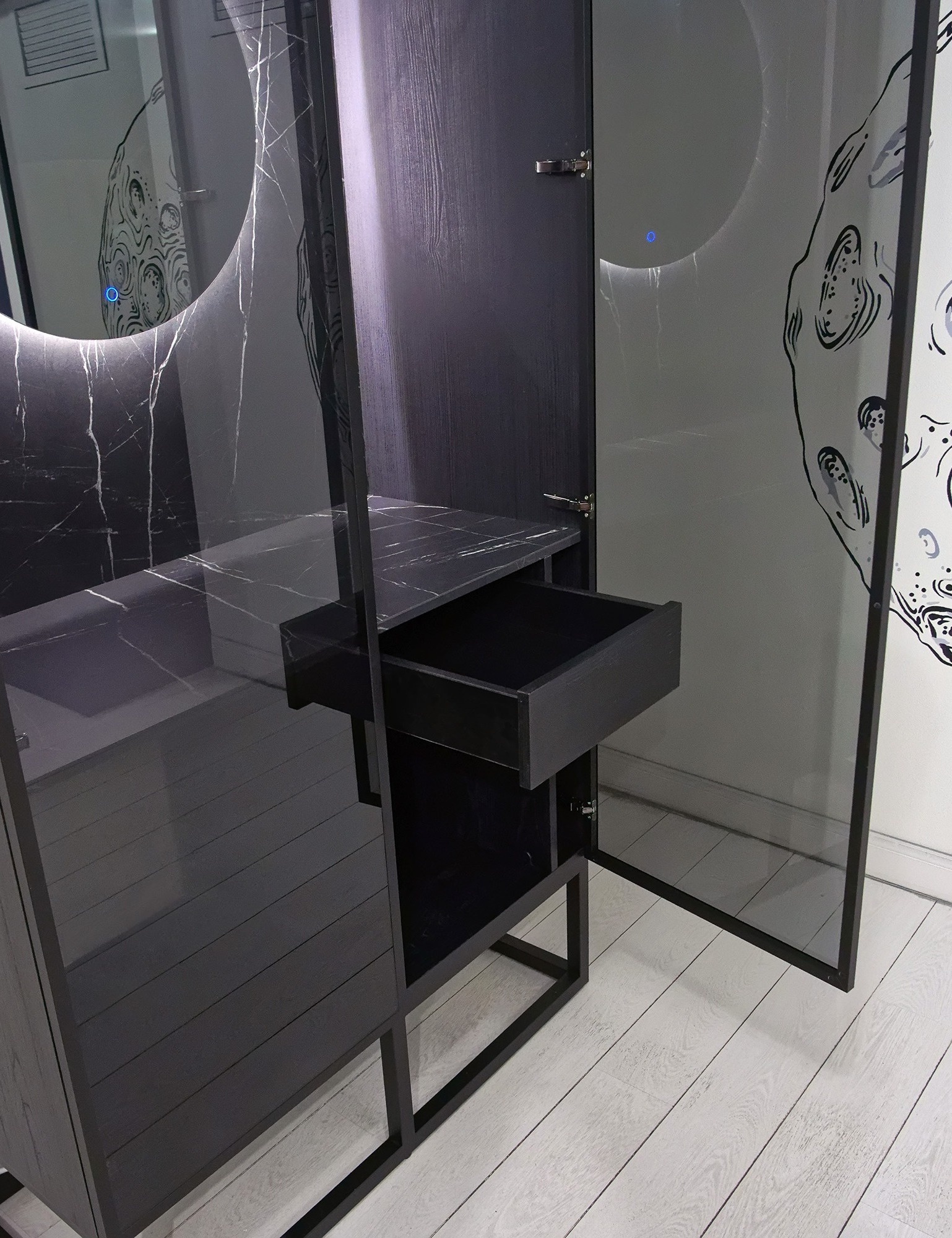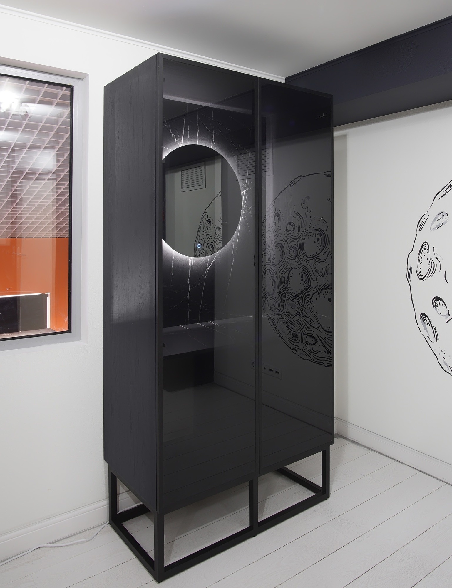 Оригинальный шкаф на заказ из черного стекла с подсветкой «Модель 1163»