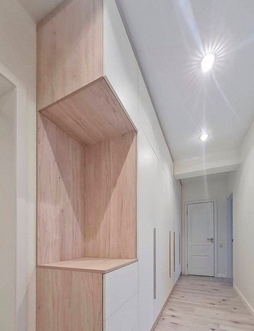 Сегодня это встроенные в интерьер шкафы в минималистичном дизайне. Однотонные фасады в пастельные тонах и с аккуратными ручками.