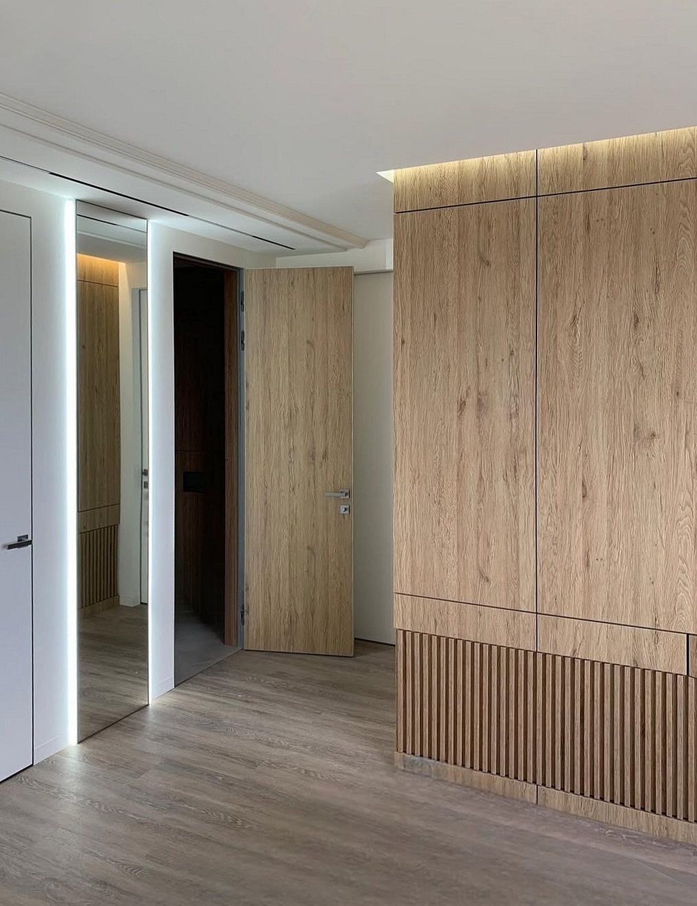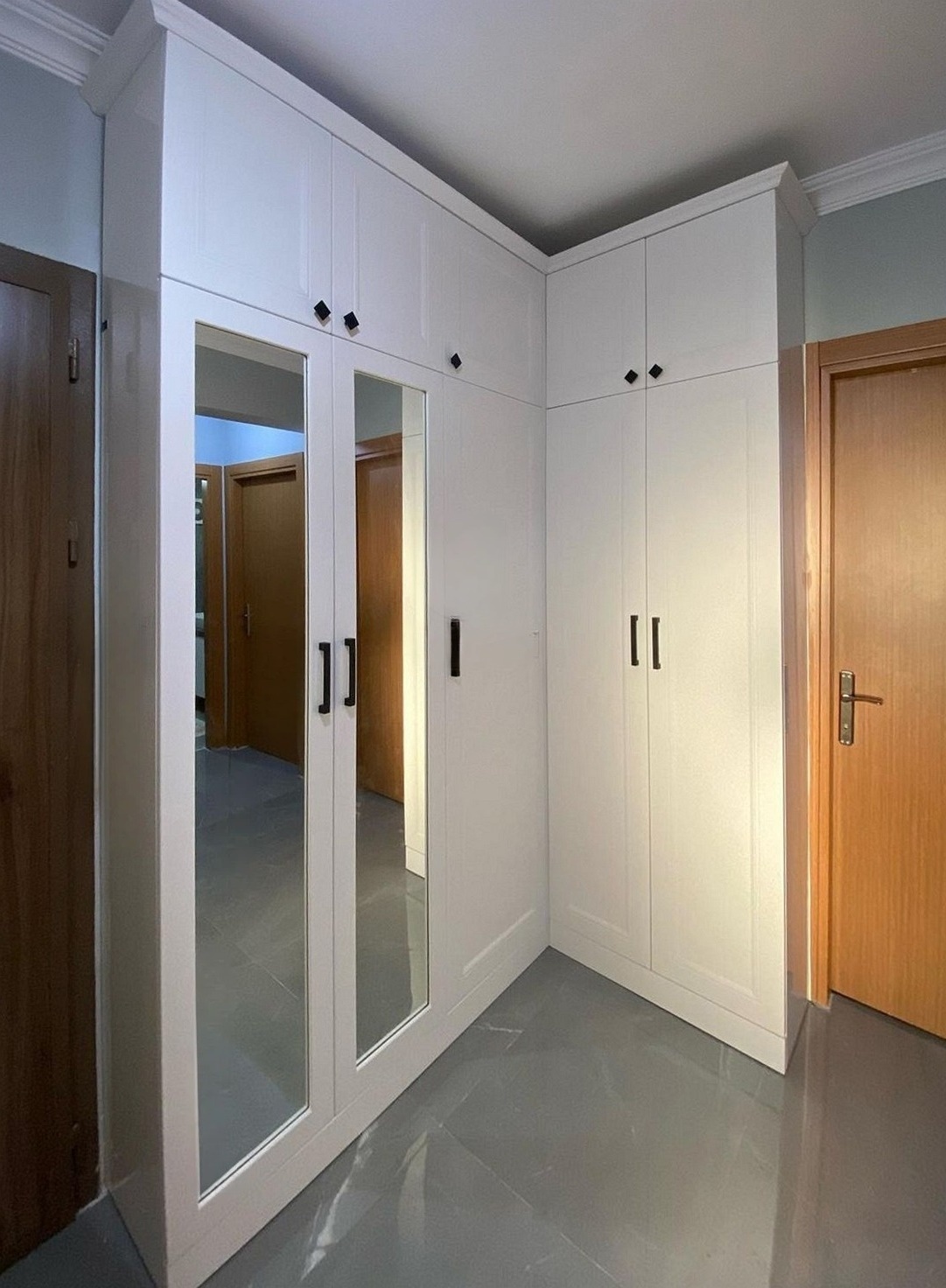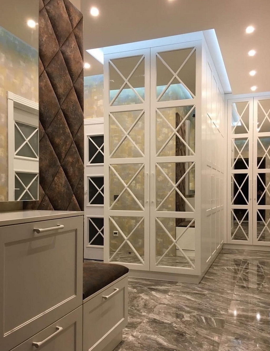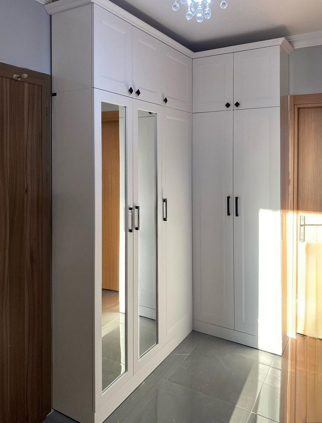 Встроенный угловой шкаф с зеркальными дверями и фрезеровкой «Модель 561»