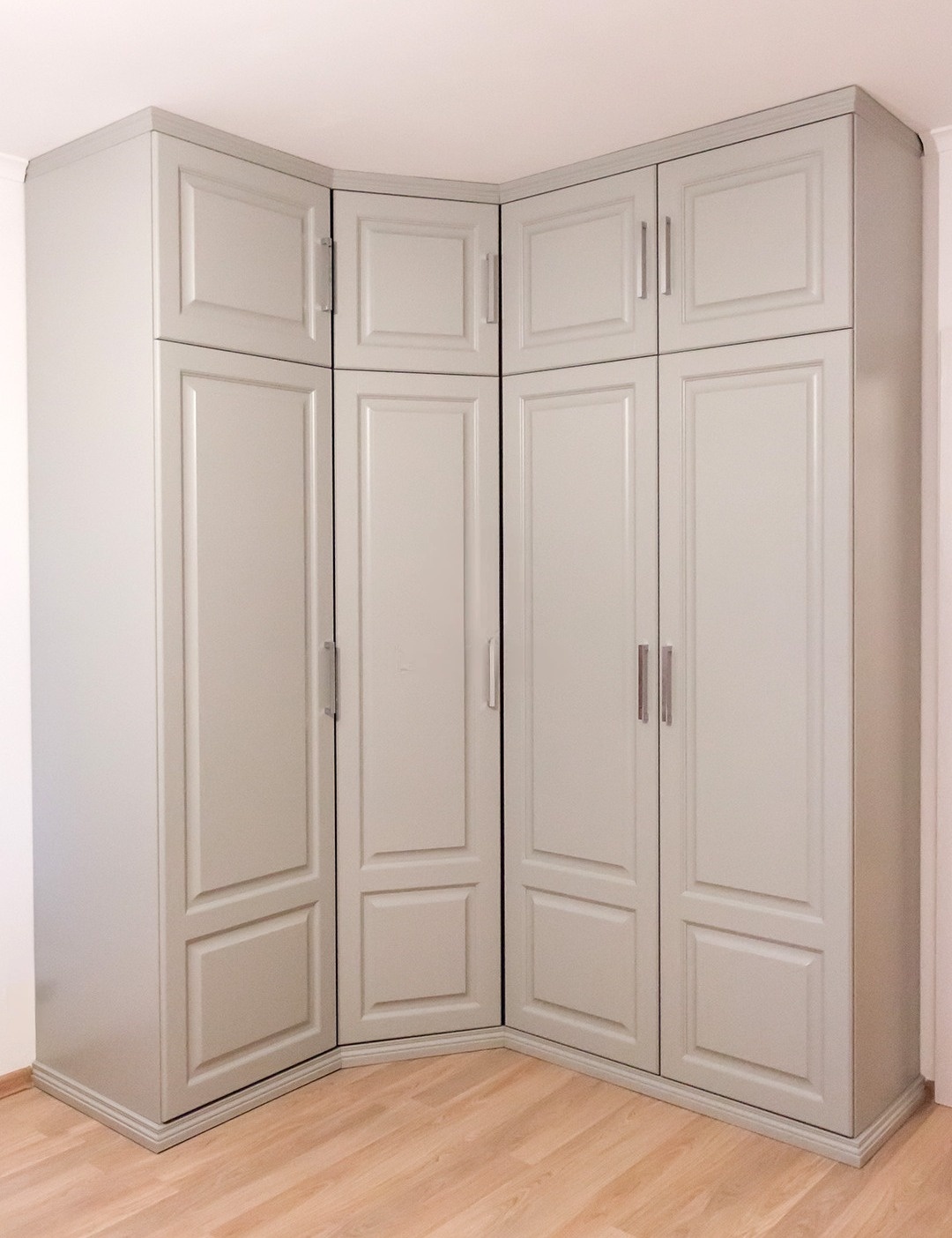 Угловой серый шкаф в классическом стиле в спальню «Модель 1193»