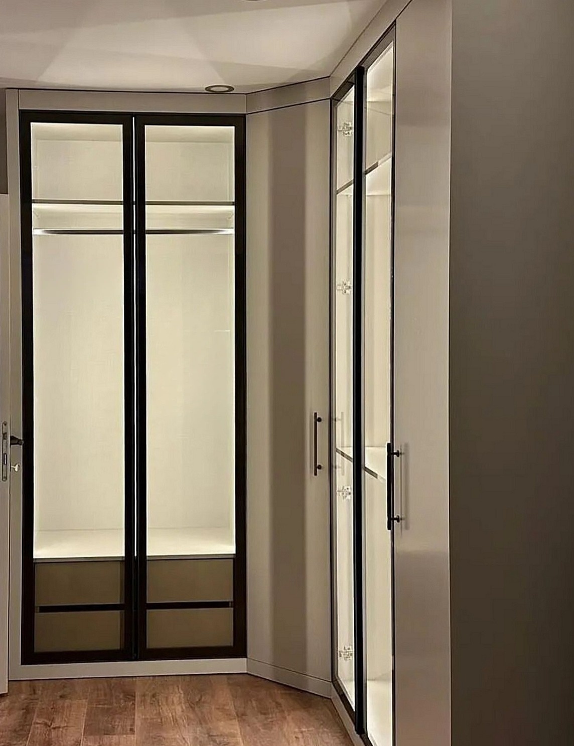 Угловой шкаф с прозрачными стеклянными дверями и подсветкой «Модель 1173»