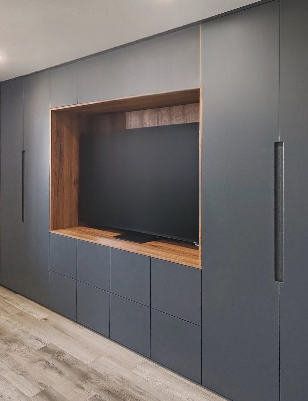 Серый шкаф во всю стену с нишей под тв «Модель 155»